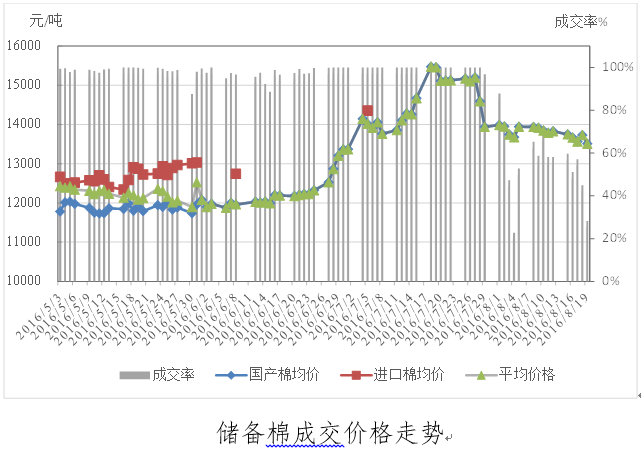 儲(chǔ)備棉出庫(kù)競(jìng)拍降溫。隨著新棉上市臨近及紡織企業(yè)棉花庫(kù)存上升,儲(chǔ)備棉競(jìng)拍較前期明顯降溫,出庫(kù)成交價(jià)及成交量均有下滑。8月以來(lái)出庫(kù)成交均價(jià)為13789元/噸,較7月均價(jià)下跌722元/噸,8月以來(lái)出庫(kù)平均成交率為55.66%,較7月平均成交率下滑43.65個(gè)百分點(diǎn)。截至8月19日,儲(chǔ)備棉累計(jì)出庫(kù)成交187.46萬(wàn)噸,成交率為89.13%,其中國(guó)產(chǎn)棉累計(jì)成交157.83萬(wàn)噸,成交率87.62%;進(jìn)口棉累計(jì)成交29.63萬(wàn)噸,成交率98.16%。累計(jì)成交平均長(zhǎng)度為28.3mm,成交最高價(jià)16490元/噸,最低價(jià)9730元/噸,折3128價(jià)格15642元/噸,成交平均價(jià)格為13172元/噸,累計(jì)成交851家。