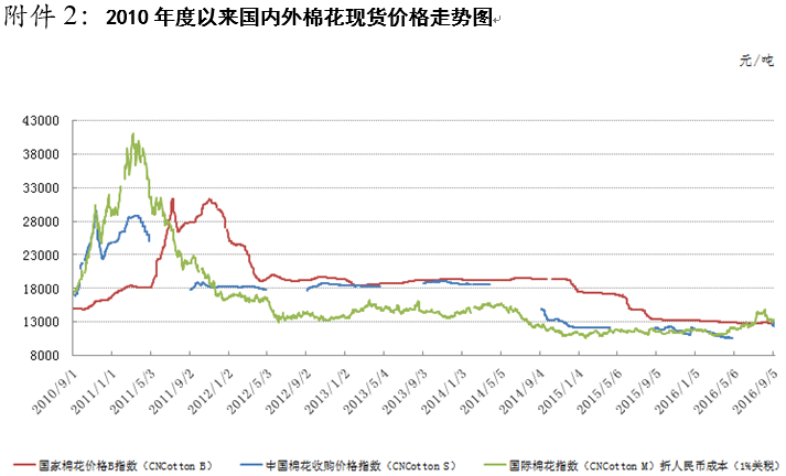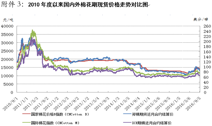 國際棉價或?qū)⑷鮿菡鹗帯?/strong>宏觀方面,9月7日,美國供應(yīng)管理協(xié)會發(fā)布數(shù)據(jù)顯示,美國8月份ISM非制造業(yè)指數(shù)為51.4%,環(huán)比下降4.1個百分點(diǎn),非制造業(yè)持續(xù)低速增長。其中,新訂單指數(shù)為51.4%,環(huán)比下降8.9個百分點(diǎn)。9月8日,歐央行發(fā)布利率決議,維持三大利率水平不變,QE月規(guī)模維持于800億歐元不變,執(zhí)行時限至2017年3月均不變,均符合多數(shù)市場預(yù)期。同日,美聯(lián)儲發(fā)布經(jīng)濟(jì)褐皮書顯示,7月中旬至8月末美國大部分地區(qū)經(jīng)濟(jì)溫和增長,預(yù)計未來數(shù)月保持溫和增長態(tài)勢。