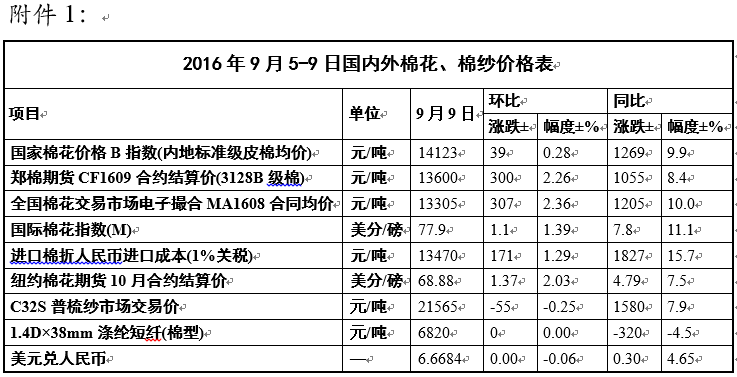 本周,國內(nèi)棉價止跌上漲。9月9日,內(nèi)地標(biāo)準(zhǔn)級皮棉銷售均價14123元/噸,較上周上漲39元/噸,漲幅0.28%,同比上漲1269元/噸,漲幅9.9%。鄭州棉花期貨9月合約結(jié)算價13600元/噸,較上周上漲300元/噸,漲幅2.26%,同比上漲1055元/噸,漲幅8.4%。全國棉花交易市場電子撮合交易9月合同均價13305元/噸,較上周上漲307元/噸,漲幅2.36%,同比上漲1205元/噸,漲幅10%。