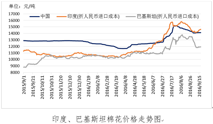 9月份,大宗商品價(jià)格走勢(shì)較弱,加上中國(guó)儲(chǔ)備棉繼續(xù)出庫(kù),國(guó)際棉價(jià)壓力較大。2016年9月19日,ICE棉花期貨主力合約結(jié)算價(jià)68.50美分/磅,環(huán)比上漲0.5美分/磅,漲幅0.7%。國(guó)際棉花指數(shù)(M)為75.81美分/磅,環(huán)比下跌2.7美分/磅,跌幅3.4%,按1%關(guān)稅計(jì)算,折人民幣進(jìn)口成本13000元/噸(匯率按海關(guān)計(jì)征匯率6.6056計(jì)算,下同),低于國(guó)家棉花價(jià)格B指數(shù)(代表內(nèi)地白棉3級(jí)價(jià)格)1169元/噸。