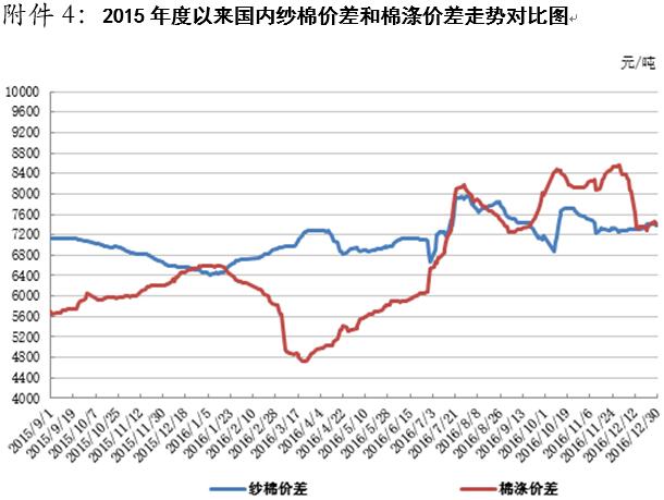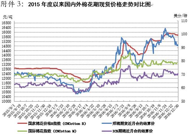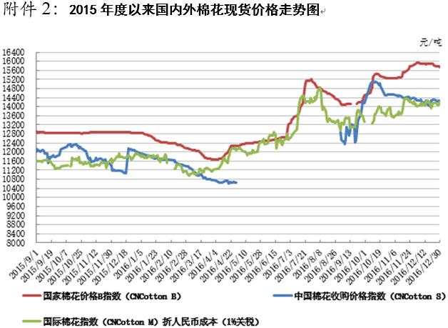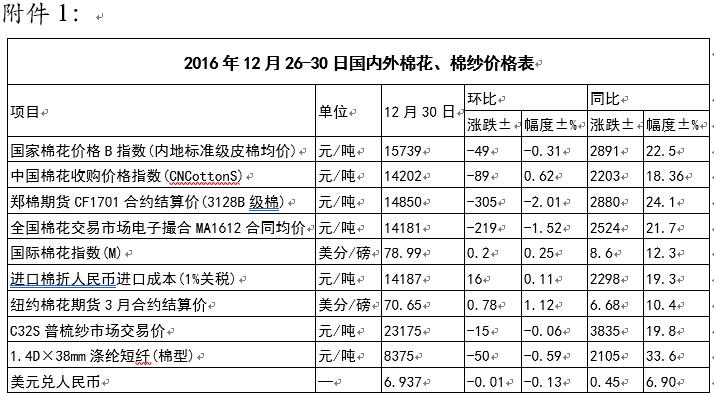 本周,國(guó)內(nèi)棉花現(xiàn)貨價(jià)格持續(xù)弱勢(shì),鄭棉價(jià)格大幅下挫后振蕩回升。12月30日,內(nèi)地標(biāo)準(zhǔn)級(jí)皮棉銷(xiāo)售均價(jià)15739元/噸,較上周下跌49元/噸,跌幅0.31%,同比上漲2891元/噸,漲幅22.5%。全國(guó)棉花交易市場(chǎng)電子撮合交易1月合同均價(jià)14181元/噸,較上周下跌219元/噸,跌幅1.52%,同比上漲2524元/噸,漲幅21.7%。鄭州棉花期貨CF1701合約結(jié)算價(jià)14850元/噸,較上周下跌305元/噸,跌幅2.01%,同比上漲2880元/噸,漲幅24.1%。