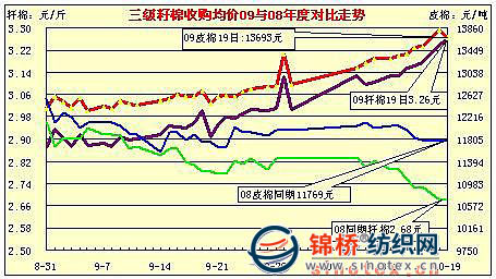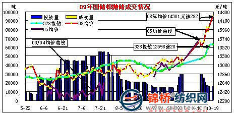 10月19日計(jì)劃拋售2008年度儲備棉16546噸,全部成交;平均等級3.07,較昨日降低0.09,平均長度28.11,較上一日降低0.23;加權(quán)成交價14301元/噸,較昨日漲282元,折328級成交價為14315元/噸,較昨日漲352元,最高成交價14940元,最低13880元。其中328級均價14396元/噸,漲379元,最高14940元/噸,最低14060元/噸。截止10月19日,累計(jì)成功拋售儲備棉1977287噸,其中2008年度儲備棉1349903噸,2003-2005年度棉花627484噸 ;當(dāng)日有258家交易商參與競賣,有59家企業(yè)最終成交,當(dāng)日推出資源總捆數(shù)99捆,實(shí)際成交99捆。