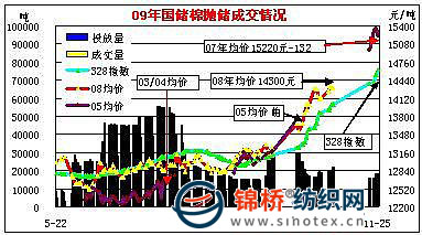 11月25日計(jì)劃拋售2006、2007年度儲(chǔ)備棉18009噸,全部成交;平均等級(jí)3.9,較昨上一日低0.05,平均長(zhǎng)度29,較上一日低0.02。今日棉花協(xié)會(huì)公布“國(guó)家棉花調(diào)控會(huì)商聯(lián)席會(huì)議”內(nèi)容,棉花進(jìn)口配額有望年內(nèi)下發(fā),拋儲(chǔ)棉成交價(jià)回落百余元。今日拋儲(chǔ)棉加權(quán)平均成交價(jià)15220元/噸,較上一日跌132元,折328級(jí)成交價(jià)為15478元/噸,較上一日跌107元。其中329級(jí)成交均價(jià)15102元/噸,跌99元,最高價(jià)15600元,平,最低14600元,跌220元;429級(jí)均價(jià)15201元/噸,跌194元,最高價(jià)15600元,跌300元,最低價(jià)14860元,跌300元。截止11月25日,累計(jì)成功拋售儲(chǔ)備棉2202854噸,其中2008年度儲(chǔ)備棉1507029噸,2003-2007年度棉花695825噸 ;當(dāng)日有300家交易商參與競(jìng)賣(mài),有48家企業(yè)最終成交,當(dāng)日推出資源總捆數(shù)89捆,實(shí)際成交89捆。