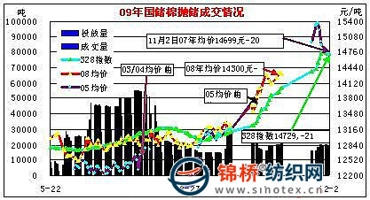 12月2日計劃拋售2006、2007年度儲備棉18063噸,全部成交;平均等級3.76,較昨上一日高0.03,平均長度29.05,較上一日高0.08;加權(quán)成交價14699元/噸,較上一日跌20元,折328級成交價為14880元/噸,較上一日跌44元。其中主體品級429級成交均價14683元,跌13元,最高價15300元,最低14000元。截止12月2日,累計成功拋售儲備棉2301187噸,其中2008年度儲備棉1507029噸,2003-2007年度棉花794158噸 ;當日有279家交易商參與競賣,有47家企業(yè)最終成交,當日推出資源總捆數(shù)98捆,實際成交98捆。