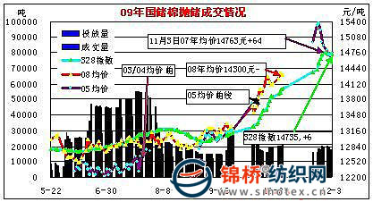 今日魏橋紡織成交2163噸,占總成交量的12%,成交均價(jià)14731元,最高價(jià)14760元,最低14700元;魯棉集團(tuán)天元紡織成交2189噸,占12.1%,均價(jià)14876元,漲35元,最高價(jià)14880元,最低14850元。截止12月3日,累計(jì)成功拋售儲(chǔ)備棉2319274噸,其中2008年度儲(chǔ)備棉1507029噸,2003-2007年度棉花812254噸 ;當(dāng)日有291家交易商參與競(jìng)賣,有58家企業(yè)最終成交,當(dāng)日推出資源總捆數(shù)103捆,實(shí)際成交103捆。