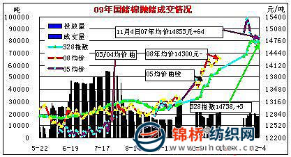 12月4日計劃拋售2006、2007年度儲備棉17021噸,抽放量較前減少近三千噸,全部成交;平均等級3.87,較昨上一日降低0.08,平均長度29.00,較上一日提高0.06;加權(quán)成交價14853元/噸,較上一日漲90元,折328級成交價為15091元/噸,較上一日漲115元。其中主體429級均價14837元,漲92元,最高價15280元,最低14620元。魏橋當天成交1759噸,占成交總量的10.3%,成交均價14796元,漲65元;淄愽蘭雁成交1354噸,均價14884元,最高價14900元,最低價14860元;魯棉集團天元公司成交1199噸,均價15051元,漲175元,最高價15290元,最低14900元;保定銀祥棉業(yè)成交965噸,均價14768元,最高價14820元,最低14740元。截止12月4日,第三批50萬噸拋儲計劃累計成功拋售儲備棉201782噸。當日有245家交易商參與競賣,有43家企業(yè)最終成交,當日推出資源總捆數(shù)94捆,實際成交94捆。