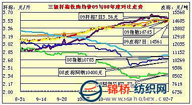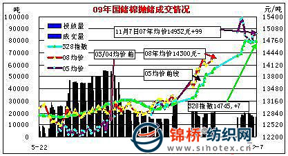 今日成交最多的分別為:魏橋紡織1963噸,占總成交量的11.5%,均價14875元/噸,漲79元;臨清三和紡織成交1398噸,占8.2%,均價15336元/噸;魯棉集團(tuán)天元紡織成交1251噸,占7.4%,均價14898元/噸,跌153元;淄愽蘭雁成交1245噸,占7.3%,均價15055元;保定銀祥棉業(yè)成交1112噸,占6.5%,均價14792元/噸,漲24元;山東岱銀紡織成交957噸,占5.6%,均價14796元/噸等。 截止12月7日,累計成功拋售儲備棉2353305噸,其中2008年度儲備棉1507029噸,2003-2007年度棉花846276噸;當(dāng)日有288家交易商參與競賣,有49家企業(yè)最終成交,當(dāng)日推出資源總捆數(shù)103捆,實際成交103捆。