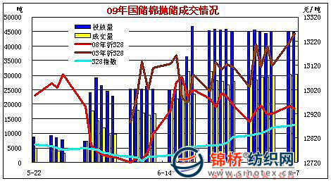 7月7日計劃拋售儲備棉數(shù)量為44807噸,其中,2003/04年度儲備棉16789噸,2008年度收儲棉28018噸。實際成交30294噸,其中2003/04年度推出的16789噸計劃全部成交,2008年度棉花成交13505噸,流拍14513噸。當日成交2008年度儲備棉平均等級3.31,平均長度28.16,加權成交價12840元/噸,跌27元,折328級成交價為12938元/噸,跌12元;當日成交2003年度儲備棉平均等級4.9,平均長度27.23,加權成交價12399元/噸,跌68元,折328級成交價為13200元/噸,漲38元。