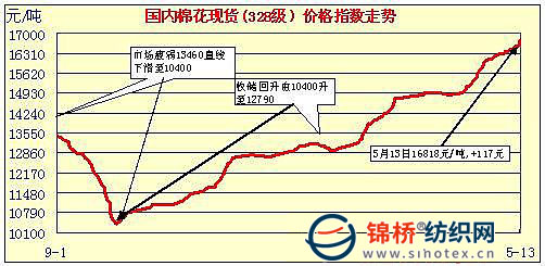 中國棉花價(jià)格指數(shù)行情——現(xiàn)貨單邊上漲行情顯現(xiàn)(5-13)