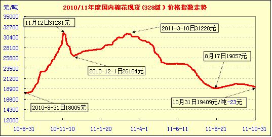 10月份全月棉價基本呈持續(xù)小幅回落態(tài)勢,全月平均累計跌幅560元左右,基本抵消了9月份的漲幅(9月份累計上漲660元左右),棉價全線跌至收儲價線以下。在這其中,魏橋紡織自10月15日來連續(xù)三次下調(diào)采購對棉價下跌起至摧化劑作用。由于價格的持續(xù)下跌,10月份的收儲量逐步攀升,由9月份全月收儲為零,10月逐步增加至日萬嗎以上,截止10月28日,收儲量以達9.6萬噸。與此同時,因價格下跌均達到預期收益,棉農(nóng)惜售和棉花經(jīng)營企業(yè)收購謹慎,加上民間資金退出大部分棉花收購,新棉采購進度遲緩。