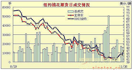 26日紐約期棉獲假日前買盤支持,大幅收高,多數(shù)合約漲幅超過200點,近期12月合約漲幅達378點。當日期棉市場高開高走,受假日前買盤支持及外圍市場帶動,午盤時棉價大幅走高,12月合約最高至45.31美分/磅,3月合約至46.63美分/磅,盤終各合約大幅收高,12月合約漲378點,收于46.15美分/磅,3月合約漲280點,收于46.55美分/磅。當日原油期貨收高3.67美元,至54.38美元;大豆收高3美分,至8.86美元。 |