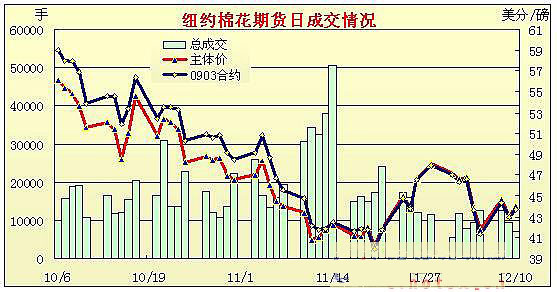 12月10日,美國(guó)國(guó)會(huì)和白宮對(duì)汽車救助達(dá)成原則一致意見,利好美國(guó)股市和商品市場(chǎng),原油和谷物上揚(yáng)兼美元走弱刺激期棉大幅攀升,尾盤隨股市滑落而抹去大多漲幅,盤終3月合約漲72點(diǎn)收于43.67美分。 當(dāng)日紐約期棉小幅高開,受助于外圍上揚(yáng)態(tài)勢(shì),部分空頭回補(bǔ),同時(shí)賣盤壓力較輕,期棉快速上沖,3月合約最高上揚(yáng)至44.99美分,漲幅高達(dá)204點(diǎn);臨近尾盤,股市漲幅削減,期棉快速回調(diào),大半漲幅被抹去,盤終各合約均保持上揚(yáng),雖漲幅不大。觀望氣氛依然濃厚,不過(guò)市場(chǎng)成交比前日略現(xiàn)活躍。 美國(guó)白宮周三表示,布什政府和國(guó)會(huì)領(lǐng)袖就拯救受困的美國(guó)汽車制造商計(jì)劃已經(jīng)達(dá)成一項(xiàng)“良好的概念性協(xié)議”,對(duì)股市和市場(chǎng)起到一定的提振;同時(shí)美國(guó)11月份聯(lián)邦預(yù)算赤字已經(jīng)高達(dá)1644億美元,為11月份赤字高位,其原因主要為救助計(jì)劃,此消息對(duì)美元有一定的壓力,美元全天較弱。而原油則反彈欲望較強(qiáng),保持強(qiáng)勢(shì)上揚(yáng)態(tài)勢(shì)。 紐約棉花期貨首期0903合約近三個(gè)交易日交易走勢(shì)