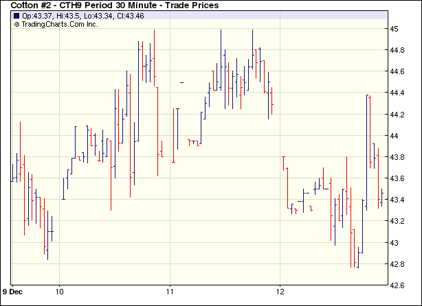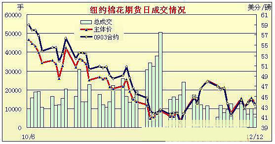 12月12日,美國參議院意外否決汽車業(yè)的救助計劃,全球股市和電子盤交易時段的商品市場受挫低位運(yùn)行,其后政府表態(tài)將采取其它途徑,挽回市場信心,美元盤中走強(qiáng),原油走弱,紐約期棉窄幅震蕩,盤終近期合約跌幅較大,但遠(yuǎn)期合約小幅上揚(yáng),交投縮量。 當(dāng)日紐約期棉小幅低開,汽車救援案意外受挫打擊全球股市信心,同時美元走強(qiáng),投機(jī)資金打壓令期棉快速回落,低位有少量承接買盤,同時市場傳言白宮可能通過TARP來救助汽車業(yè),令市場略有回暖,期棉快速收復(fù)跌勢,但尾盤再度遭遇投機(jī)賣盤打壓,近期3月合約盤終跌103點(diǎn)收于43.43美分,遠(yuǎn)期合約則有小幅上漲。 分析機(jī)構(gòu)下調(diào)美國2009年度玉米和棉花的播種面積,同時調(diào)高大豆的種植面積。估計美國棉花種植面積為765.2萬英畝,而USDA預(yù)計08/09年度的美棉種植面積是941萬英畝。美元雖盤中有所走強(qiáng),但最高并未突破60日均線84.096,顯示繼續(xù)弱勢,市場預(yù)測下周二美聯(lián)儲將繼續(xù)調(diào)降基準(zhǔn)利率,抑制了美元漲勢。 紐約棉花期貨首期0903合約近三個交易日交易走勢 |
