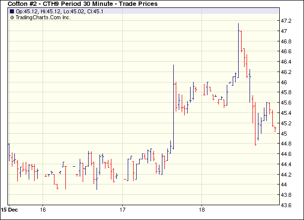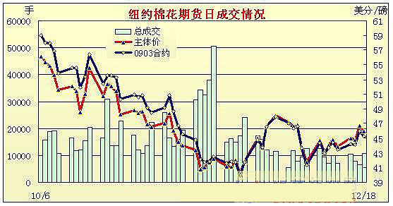12月18日,美元超跌反彈,原油大跌收于四年半新低,盤中跌破36美元;美棉出口周報顯示上周美棉簽約和裝運均處于低位;獲利平倉和外圍壓力致使期棉回落,盤終各合約中幅收低。 當日紐約期棉微弱低開,小幅震蕩后期棉3月合約漲至日內(nèi)高點47.14美分,但出口不濟,資金獲利回吐,買盤衰竭,兼外圍弱勢打壓期棉回落,并觸發(fā)止損賣盤,期棉快速打壓至45.50以下,其后獲得部分支撐,盤終3月合約跌68點收于45.28美分,其它合約也中幅下挫。 12.5-12.11日美國凈簽約出口本年度陸地棉17713噸,較前一周減29%;裝運40460噸,為本年度最低。市場對經(jīng)濟的憂慮再度升溫,原油18日暴跌近10%,逼近36美元,為四年半新低價位;而COMEX銅期貨也觸及四年新低,倫銅跌破3000。 紐約棉花期貨首期0903合約近三個交易日交易走勢 |