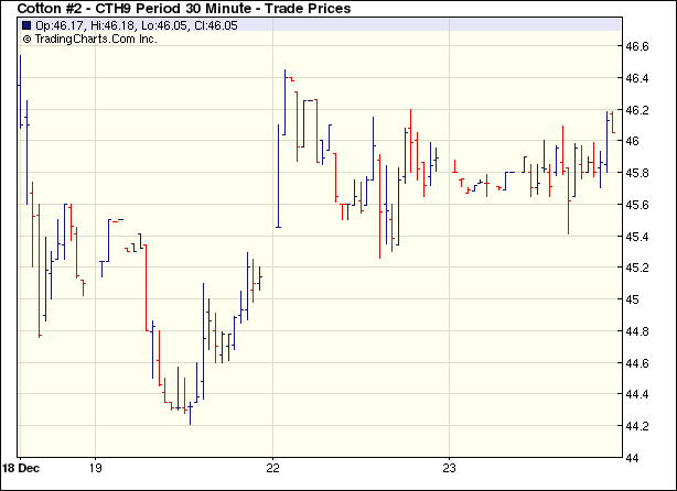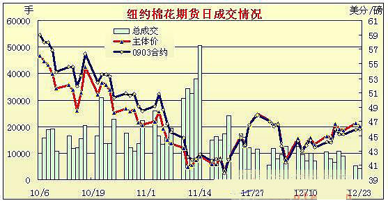 當(dāng)日紐約期棉平開,早盤在強(qiáng)勢美元之下期棉小幅回落,但隨后投機(jī)買盤又推動期棉回穩(wěn),整個交易日波動區(qū)間不大,收盤時期棉3月合約微漲13點(diǎn)收于46.02美分,其它合約漲幅也在25點(diǎn)以內(nèi)。節(jié)假日前交投繼續(xù)萎縮,24日期棉交易提前收盤,25日休市一天,周五開始正常交易。