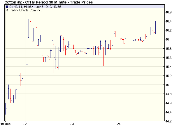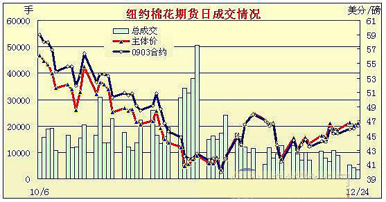 12月24日為節(jié)前最后一個交易日,交易時間縮短,美元走軟,為農(nóng)產(chǎn)品走強提供支撐,但原油大跌逾9%,紐約期棉交投稀疏,繼續(xù)小幅揚升,盤終部分合約收平,其它合約小漲30點左右。 當日期棉平開,延續(xù)近期走勢,窄幅區(qū)間內(nèi)波動,3月合約波動區(qū)間僅為45.90-46.50之間,受少量技術性買盤推動,3月合約和其它近期合約小幅上揚,其它大多合約收平,同時部分交易商已經(jīng)休假,交投大幅萎縮,僅為1400手。 12月24日公布的經(jīng)濟數(shù)據(jù)依然不樂觀,美國11月個人消費支出物價指數(shù)較前月下降1.1%;而上周失業(yè)申請救助資金人數(shù)也小幅攀升;美元小幅走弱,美國2月主力原油合約24日大跌9%,盤中逼近35美元。 紐約棉花期貨首期0903合約近三個交易日交易走勢 |