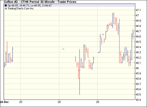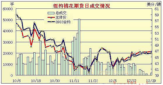 12月29日,圣誕節(jié)假期過(guò)去,年終來(lái)臨,市場(chǎng)依然交投不旺,紐約期棉在外圍市場(chǎng)主導(dǎo)下窄幅波動(dòng),盤(pán)終除近期合約上揚(yáng)7點(diǎn)外,其一合約均小幅收跌。 當(dāng)日紐約期棉小幅高開(kāi),美元走跌,而原油反彈,助推商品期貨電子盤(pán)大幅走高,期棉受助上揚(yáng),3月合約上漲至高點(diǎn)47.04美分,其后,芝加哥商品期貨大幅走低,同時(shí)美元轉(zhuǎn)而走強(qiáng),令期棉虛高的價(jià)格快速回落至平盤(pán)價(jià)位,盤(pán)終近期3月合約漲7點(diǎn)收于46.25美分,5月合約跌21點(diǎn)收于46.60美分。節(jié)假日氣氛尚未消退,交易商依然觀望,成交繼續(xù)維持低迷。 紐約棉花期貨首期0903合約近三個(gè)交易日交易走勢(shì) |