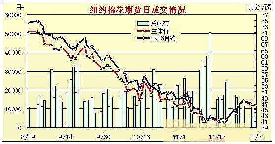 10月3日,美國股市和美元延續(xù)反彈;而原油表現(xiàn)依然疲弱,高位慢慢滑落;谷物低位震蕩,受持續(xù)買盤帶動,期棉由下跌轉(zhuǎn)為快速上揚(yáng),但隨股市回落再度縮窄漲幅至微弱漲勢收盤,終陷區(qū)間震蕩,3月合約漲27點(diǎn)收于46.60美分。 當(dāng)日紐約期棉低開,電子盤階段小幅走弱,3月合約下探至45.72美分,但其后隨美國股市強(qiáng)勁上揚(yáng),持續(xù)買盤快速拉高3月合約,最高沖至47.49美分,漲幅過百點(diǎn),但其后隨美股的下挫,期棉高位并未企穩(wěn),漲幅縮減,最后各合約保持微弱漲勢收盤。 近期期棉走勢明顯為區(qū)間震蕩,漲跌均不大,市場等候方向指引。USDA12月份的全球供需報告將于下周公布;另外將于明日公布的最新出口和近期的經(jīng)濟(jì)數(shù)據(jù)都對期棉走勢有所影響。 紐約棉花期貨主力0903合約近三個交易日交易走勢
