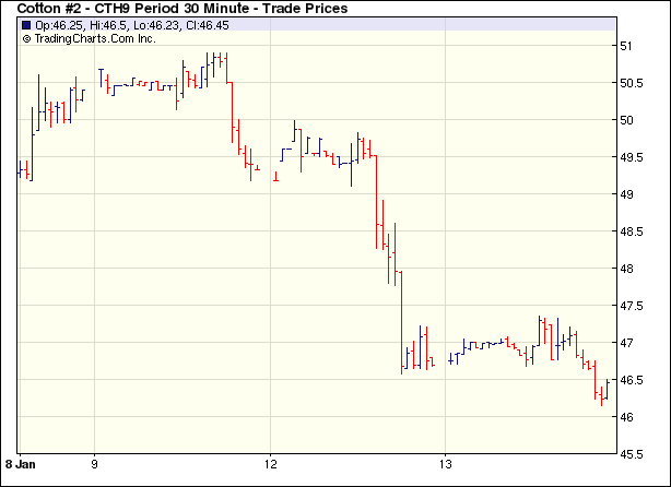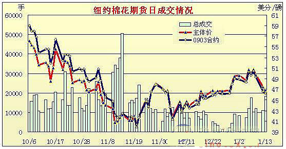 1月13日紐約期棉交投縮量,先漲后跌,受美國(guó)股市及外圍谷物市場(chǎng)的影響,各合約小幅收跌。當(dāng)日市場(chǎng)開盤后受買盤支持小幅走高,3月合約最高至47.35美分/磅。由于美國(guó)股市弱勢(shì)及玉米價(jià)格下跌,導(dǎo)致期棉受投機(jī)賣盤打壓,價(jià)格一路下滑,抵消之前的漲幅并小幅收低。3月合約跌44點(diǎn),收于46.23美分/磅;5月合約跌28點(diǎn),收于47.09美分/磅。 紐約棉花期貨首期0903合約近三個(gè)交易日交易走勢(shì) |