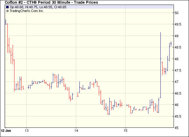 1月15日紐約期棉交投略顯活躍,大豆期貨價格走強(qiáng)刺激期棉買盤活躍,促各合約大幅收高,主力3月合約最為強(qiáng)勢。當(dāng)日市場開盤后小幅震蕩,外圍谷物市場大豆價格高漲,導(dǎo)致期棉買盤活躍,棉價快速攀升并觸發(fā)止損買盤。3月合約最高至49.15美分/磅,較開盤高318點。盤終各合約大幅收高,3月合約漲幅最大,為253點,收于48.53美分/磅;5月合約漲221點,收于49.11美分/磅。 分析師指出,雖然昨日美國股市及原油市場繼續(xù)呈現(xiàn)弱勢,但期棉市場未受其影響,僅在大豆價格的指引下走出大漲行情。此外,昨美棉出口周報顯示上周美國凈簽約出口本年度陸地棉28282噸,較前一周減45%,低于市場預(yù)期;陸地棉裝運量為44928噸,較前一周增2%。 紐約棉花期貨首期0903合約近三個交易日交易走勢 |