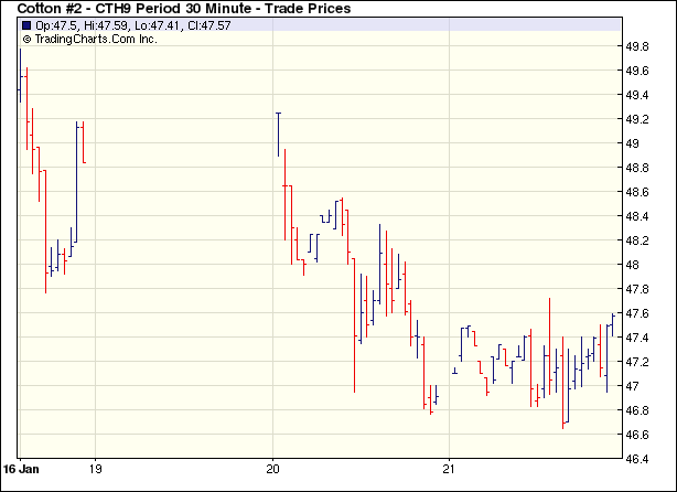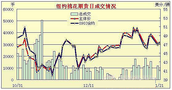 1月21日,受外圍商品市場(chǎng)及美國(guó)股市走強(qiáng),紐約期棉在少量買盤支持下小幅收高,成交量仍不足萬(wàn)手。當(dāng)日期棉市場(chǎng)開(kāi)盤后窄幅震蕩,3月合約一度跌至最低點(diǎn)46.65美分/磅,但很快反彈,盤終各合約小幅收高。原油及外圍谷物市場(chǎng)玉米和大豆價(jià)格收漲為棉市帶來(lái)支持。此外周三紐約股市在科技和金融板塊的帶動(dòng)下全線大幅反彈,幾大股指上漲,也為棉花等商品市場(chǎng)帶來(lái)一定利好。ICE期棉3月合約漲42點(diǎn),收于47.23美分/磅;5月合約漲54點(diǎn),收于47.79美分/磅。 紐約棉花期貨首期0903合約近三個(gè)交易日交易走勢(shì) |