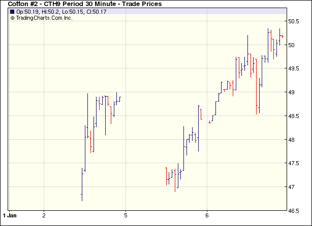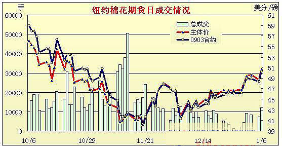 1月6日紐約期棉成交近2萬手,受外圍市場(chǎng)帶動(dòng),在買盤的有力支持下,期棉市場(chǎng)大幅收漲,達(dá)兩個(gè)月以來的最高點(diǎn)。 當(dāng)日市場(chǎng)開盤后便大幅走高,外圍市場(chǎng)原油及谷物上漲為期棉市場(chǎng)帶來支撐,在買盤的強(qiáng)力支持下,3月合約一舉突破50美分一線,最高至50.34美分/磅。盤終各合約收于高位,3月合約漲197點(diǎn),收于50.28美分/磅,為兩個(gè)月以來最高(11月4日為50.87美分/磅);5月合約漲188點(diǎn),收于50.60美分/磅。有分析師指出,昨日基金買盤大量增加多頭持倉,可能是受2009年道瓊斯-AIG商品指數(shù)目標(biāo)加權(quán)調(diào)整以及奧巴馬將擴(kuò)大經(jīng)濟(jì)復(fù)興計(jì)劃規(guī)模的影響。此外,下年度美棉面積看減,也將對(duì)棉價(jià)形成一定支持。 紐約棉花期貨首期0903合約近三個(gè)交易日交易走勢(shì) |