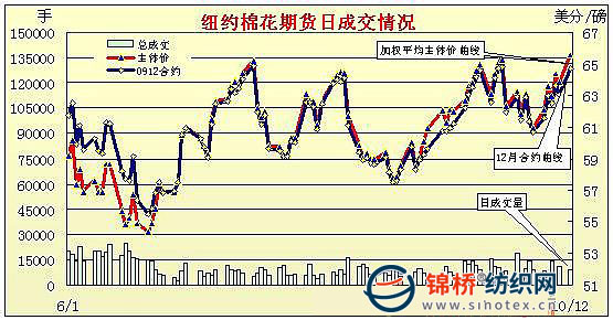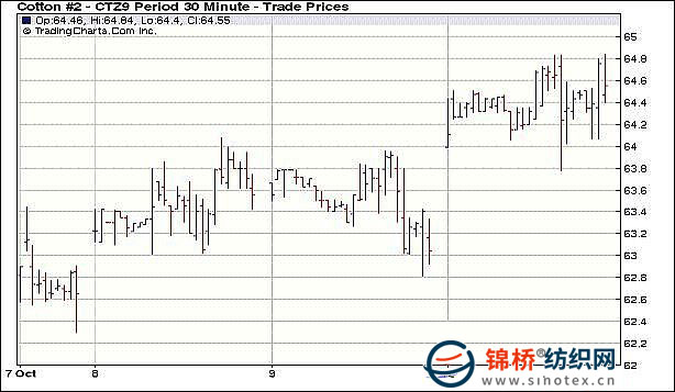 10月12日,紐約期棉以大漲收盤,成交價(jià)直逼一年來高點(diǎn),近期12月合約上漲166點(diǎn),至64.68美分/磅,直指65美分關(guān)鍵壓力位。當(dāng)日市場開盤并無出彩表現(xiàn),芝加哥商品市場開盤后大豆、玉米和小麥期貨上漲,美國股市上揚(yáng),刺激投機(jī)買盤支持期棉走強(qiáng),盤中12月合約最高上漲至64.84美分,距離65美分僅一步之遙,最終市場在近高位收盤。市場密切關(guān)注10月份主產(chǎn)棉區(qū)的天氣狀況,目前中南棉區(qū)持續(xù)降雨,對吐絮的棉花不利,德州平原地區(qū)也因低溫受到一定影響。美國農(nóng)業(yè)部10月份報(bào)告中對美國棉花產(chǎn)消存的調(diào)整對市場并無實(shí)質(zhì)性利好,但如果天氣狀況進(jìn)一步惡化,基本面將發(fā)生變化,不排除交易商炒作基本面的可能。 紐約棉花期貨首期0912合約近三個交易日交易走勢 |