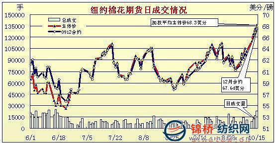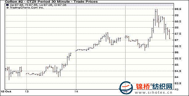 10月15日期棉市場拋開谷物期貨全面下跌的影響,借助于基金買盤再度收漲,美元下跌和原油期貨上漲也給予一定動力,近期合約結(jié)算價67.64美分/磅,上漲56點。市場總成交量有所增加;12月合約連續(xù)增倉。當(dāng)日市場弱勢開盤,后在投機(jī)買盤大力支持下反向走高,當(dāng)近期合約突破67.61美分后連續(xù)引發(fā)止損買單,市場出現(xiàn)暴漲,近期12月合約最高漲至69.49美分,漲幅達(dá)到241點;獲利了結(jié)賣盤迫使市場吐出部分漲幅,最終以中幅上漲收盤。 紐約棉花期貨首期0912合約近三個交易日交易走勢 |