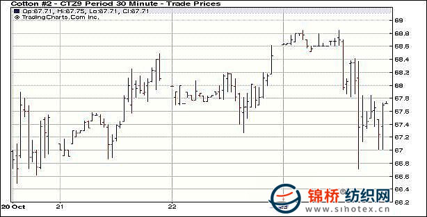 10月23日,由于市場預(yù)期美聯(lián)儲有望升息,刺激美元大幅上漲,繼而對商品市場帶來利空消息,近期漲幅喜人的期棉在投機賣盤和期權(quán)賣盤的打壓下順勢調(diào)整,盤終近期12月合約跌117點,其它合約跌幅在100點之內(nèi)。當日紐約期棉開盤即承受壓力,早盤在美元走強的背景下漲勢有所抑制,隨著12月合約跌破關(guān)鍵價位67.89美分,其它合約也紛紛跟隨回落,低位獲得部分買盤支撐,但新的賣盤壓力和看跌期權(quán)買盤再度施壓,同時技術(shù)面的調(diào)整需求也促使期棉展開第二波下跌,不過買盤支撐限制了期棉的跌幅。成交依然相對活躍。 紐約棉花期貨首期0912合約近三個交易日交易走勢 |