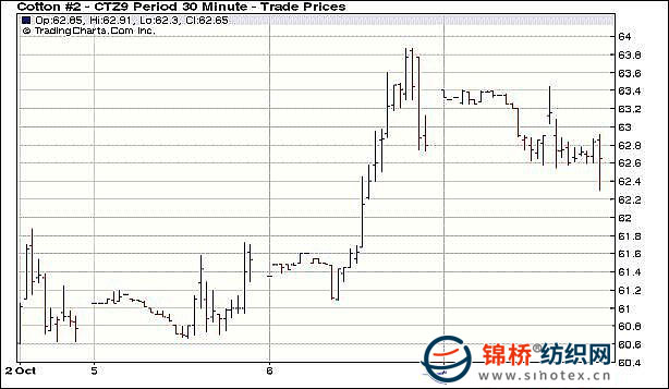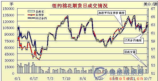 10月7日,外圍強(qiáng)勢上揚(yáng)態(tài)勢暫時(shí)中止,美國股市和美元均小幅波動,期棉區(qū)間波動,部分投機(jī)賣盤打壓期棉小幅回落,盤終各合約跌幅均在60點(diǎn)之內(nèi)。當(dāng)日期棉小幅高開,外圍強(qiáng)勢給與期棉動力,期棉升至高點(diǎn),但遭遇投機(jī)賣盤的阻擊,期棉回落,同時(shí)美元走堅(jiān),股市走勢復(fù)雜,也為期棉增添部分壓力,另外市場在靜候USDA將于周五公布的月度供需報(bào)告,買盤不振,更是促使期棉回落。 紐約棉花期貨首期0912合約近三個(gè)交易日交易走勢 |