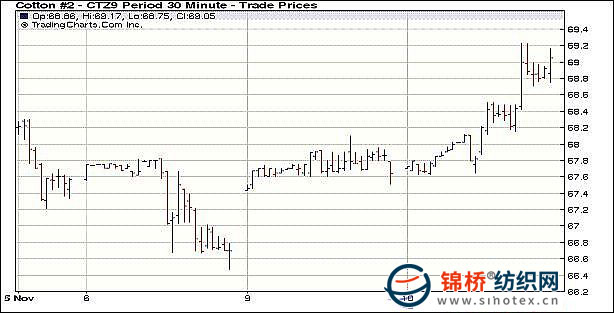 11月10日美國農(nóng)業(yè)部(USDA)最新供需報告利多,紐約期棉受支撐強(qiáng)勢上漲且成交放量。當(dāng)日近期12月合約收于69.05美分/磅,漲144點(diǎn),為08年10月3日(69.76美分/磅)以來最高點(diǎn);3月合約收于72.84美分/磅,漲139點(diǎn)。當(dāng)日期棉市場平開高走,由于USDA最新供求預(yù)測調(diào)減美國及全球棉花產(chǎn)量,同時調(diào)高全球消費(fèi)量,因此對期棉形成有力支撐。在買盤支持下期棉走高,且盤中觸發(fā)止損買盤,進(jìn)一步助漲價格,12月合約最高至69.23美分/磅。最終各合約收漲123-148點(diǎn)。 紐約棉花期貨首期0912合約近三個交易日交易走勢 |