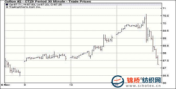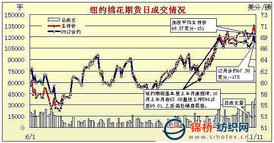 11月11日美元先抑后揚,紐約期棉受此影響先沖高后回落,各合約大幅收跌;近期12月合于收于67.30美分/磅,跌175點;3月合約收于71.08美分/磅,跌176點。當日成交繼續(xù)放量,約4.8萬手,較前一日增加約1萬手。當日期棉高開高走,由于美元盤中走弱,接近15個月來低點,因此期棉隨外圍市場一起走強,在投機及貿易買盤支持下12月合約最高至70.61美分/磅,為該合約13個月以來最高點。之后美元反彈,期棉受到賣盤打壓,加之看跌期權買盤活躍,棉價從高點回落,一路下滑,盤終各合約跌幅均在160點以上。 紐約棉花期貨首期0912合約近三個交易日交易走勢 |