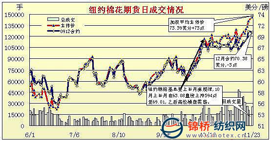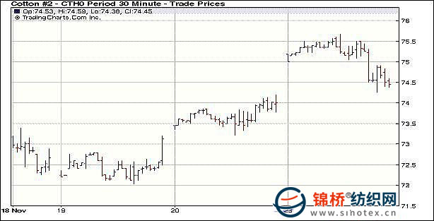 11月23日,美元再度大幅下挫,大宗商品上揚(yáng),兼中國(guó)鄭州棉花期貨漲停影響,紐約期棉早盤(pán)沖高,但午盤(pán)后回落,盤(pán)終近期12月合約微跌3點(diǎn),主力3月合約漲44點(diǎn),其它大多合約小幅收跌。當(dāng)日紐約期棉早盤(pán)高開(kāi),早盤(pán)繼續(xù)保持強(qiáng)勢(shì),主要受美元下跌,以及中國(guó)期棉飆漲的影響,期棉沖擊17個(gè)月來(lái)的新高,12月合約最高到72美分,3月合約沖破75美分,最高75.67美分;午盤(pán)后漲勢(shì)回落,同時(shí)期棉成交較前幾日有所縮量。