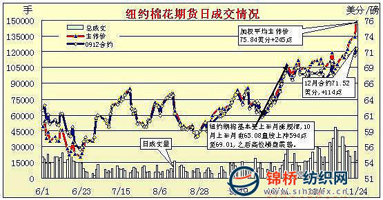 11月24日,由于對經(jīng)濟復蘇信心增強,但憂慮就業(yè)市場,對市場產(chǎn)生些許影響。美國股市低位震蕩,商品市場偏弱,但在外圍走勢偏空的背景下,紐約期棉再度收高百點,強勢顯現(xiàn)。盤終主力3月合約漲104點收于75.52美分,此時已是連續(xù)第五日上漲。當日紐約期棉小幅高開,但在外圍壓力下買盤力道似有衰竭,期棉從高位滑落,然而,尾盤再度強勢走高,大幅收漲,市場分析認為中國棉花市場的強勢連續(xù)兩日收于漲停,12月合約沒有交割量,而紡企的近期需求迫切是推動棉花走高的主要原因,因此雖然感恩節(jié)假期臨近,成交不太旺盛,同時外圍走弱,但紐約期棉依然強勢攀高,不過成交量已經(jīng)較早大幅下滑。 紐約棉花期貨主力1003合約近三個交易日交易走勢 |