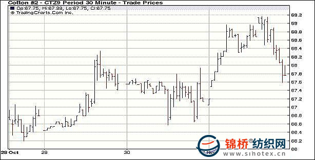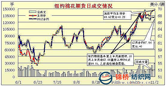 11月2日,紐約期棉受外圍市場及自身投機盤影響,沖高回落,除主力12月合約保持不變外,其它合約小幅收漲;市場成交繼續(xù)保持活躍。當(dāng)日期棉市場低開高走,由于美元走弱、商品市場走強且美股因利好經(jīng)濟消息而上漲,均為紐約期棉早盤走強帶來支持;期棉上漲過程中觸發(fā)止損買盤,主力12月合約午盤時最高至69.26美分/磅。高點時投機賣盤打壓市場,12月合約平倉及轉(zhuǎn)倉交易增加,使價格回落,盤終收于67.64美分/磅,較上周五持平;其它合約小幅收漲,3月合約收于71.09美分/磅,漲20點。 紐約棉花期貨首期0912合約近三個交易日交易走勢 |