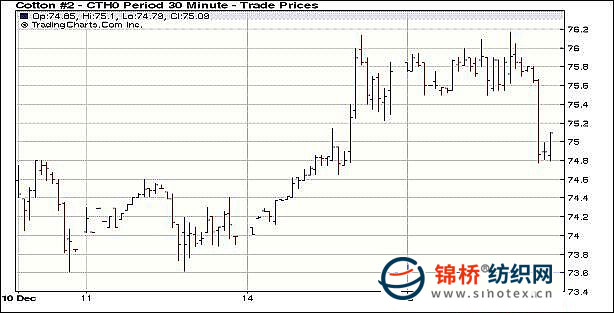 12月15日,市場(chǎng)憂慮美聯(lián)儲(chǔ)會(huì)逐步撤出其刺激政策因此推動(dòng)美元大幅走高,大宗商品回軟,紐約期棉早盤穩(wěn)定,但午盤后遭獲利平倉盤打壓,盤終各合約跌百點(diǎn)。當(dāng)日紐約期棉早盤窄幅波動(dòng),并無趨勢(shì)性方向,且交投低迷,其中3月主力合約勉強(qiáng)突破前日高位,攀升至76.17美分的高位,外圍市場(chǎng)方面,原油在經(jīng)歷連續(xù)的下跌后有所反彈,但美元大幅走高,促使其它大宗商品市場(chǎng)紛紛走低,午盤后,獲利平倉盤涌現(xiàn),兼看跌期權(quán)買盤打壓,促使期棉快速回落,盤終主力3月合約跌89點(diǎn)。成交較前日有所縮量。 紐約棉花期貨首期1003合約近三個(gè)交易日交易走勢(shì) |