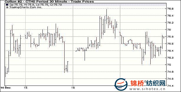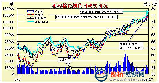 12月17日,受外部市場壓力,紐約期棉全面下滑,主力3月合約收于75.74美分/磅,跌51點,1005月合約76.26美分/磅,跌78點。當日市場開盤不久即受到投機和基金強大賣盤壓力,外部美元大漲,股市、農(nóng)產(chǎn)品期貨、金屬期貨和原油期貨集體跳水,迫使紐約期棉下挫,3月合約最低點跌至75.01美分(-124點)。相比其他期貨市場,期棉在尾段表現(xiàn)相對強勢,基本面中國用棉量預期增加對市場形成支持,最后階段3月合約回補前期部分跌幅,最終結算價75.74美分/磅。