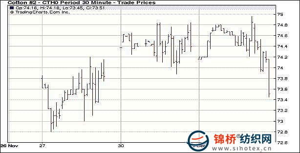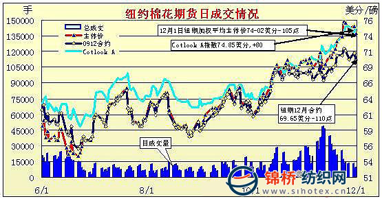 12月1日,美國(guó)股市受利好房地產(chǎn)數(shù)據(jù)刺激,大幅走高,美元走低,大多數(shù)商品市場(chǎng)反彈上揚(yáng),但期棉早盤(pán)上漲后,遭遇獲利賣(mài)盤(pán)打壓,快速回落,盤(pán)終近期12月合約跌110點(diǎn),3月合約跌120點(diǎn)。當(dāng)日紐約期棉低開(kāi),低位震蕩,但美元走低,刺激商品市場(chǎng)走高,兼少量投資者買(mǎi)盤(pán)推動(dòng),期棉上揚(yáng),然而,午盤(pán)之際,買(mǎi)盤(pán)力道衰竭,期棉快速沉降,盤(pán)終中幅收跌。同時(shí)成交縮量,當(dāng)日12月合約再簽發(fā)150份交割通知單。 紐約棉花期貨主力1003合約近三個(gè)交易日交易走勢(shì) |