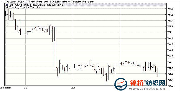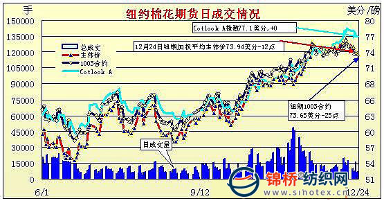 12月24日,美元繼續(xù)回落,利好大宗商品,但節(jié)假日來臨,市場交投清淡,紐約期棉窄幅波動,尾盤賣盤打壓,小幅走低。由于節(jié)假日,當日紐約期棉交易提前收盤,市場參與者采取觀望,交投極其稀少,估計成交僅2200手。紐約期棉大多數(shù)時間維持窄幅波動,在上下61點的區(qū)間內(nèi)震蕩,雖然美元走低,但并未為期棉帶來支撐,尾盤之際,少許投機賣盤打壓,期棉快速回落,盤終近期合約跌25點。當日原油繼續(xù)收高1.38美元報收每桶78.05美元。周五紐約期棉休市。 紐約棉花期貨首期1003合約近三個交易日交易走勢 |