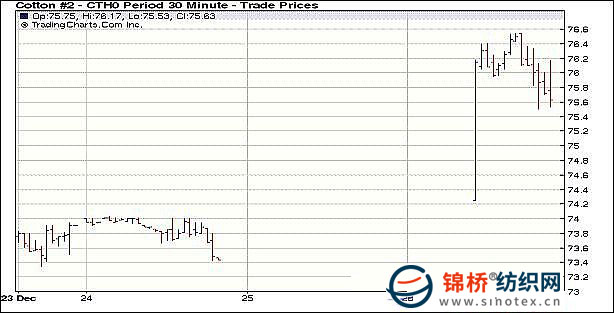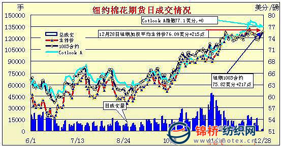 12月28日,圣誕節(jié)后美元下跌,芝加哥大豆,紐約原油等品種紛紛上揚,同時中國鄭州期棉漲停報收,經(jīng)濟復蘇信心增強,均利好紐約期棉開盤大漲,盤中窄幅波動,盤終各合約均大幅收漲,同時交投放量。當日紐約期棉交易時間縮短,但由于鄭州棉花市場漲停效應,刺激紐約期棉開盤大漲,同時,外圍利好刺激投機買盤,觸發(fā)止損買盤,近期3月主力合約盤中最高觸及76.54美分/磅的高位,之后主力3月合約從高位小幅回落,但盤終依然漲217點報收。當日大豆3月合約勁漲30美分報收每蒲式耳10.38美元。 紐約棉花期貨首期1003合約近三個交易日交易走勢
