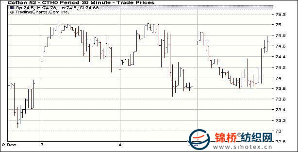 12月7日,紐約期棉受投機(jī)買盤支持中幅收漲,成交量維持低量。主力3月合約收于74.69美分/磅,漲87點(diǎn)。當(dāng)日市場(chǎng)開(kāi)盤窄幅震蕩,后受美元走強(qiáng)影響下行。美元上漲動(dòng)能減弱,期棉跌勢(shì)減緩,外部股市上漲,帶動(dòng)期棉向上,加上投機(jī)買盤支持,市場(chǎng)尾盤強(qiáng)勢(shì)反彈,最終以中幅上漲收盤。 紐約棉花期貨主力1003合約近三個(gè)交易日交易走勢(shì) |