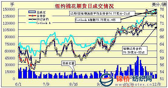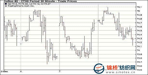 12月8日,因投資者開始將資金轉(zhuǎn)移至美元和國債等安全邊際更高的投資,促使美元匯率大漲,對整個商品期貨市場形成壓力,紐約期棉也遭波及,近期幾個合約以下跌收盤,遠月合約小幅收漲,其中主力3月合約結(jié)算價74.21美分/磅,跌48點,1005月合約收于75.42美分/磅,跌37點。當(dāng)日市場開盤后的一個小時內(nèi)呈上漲態(tài)勢,主力3月合約突破75美分,但當(dāng)達到75.09美分的高點后因缺乏買盤跟進市場掉頭向下。受美元上漲影響,美國股市及商品市場承壓下跌,期棉市場受到連累,獲利了結(jié)賣盤打壓迫使市場回吐之前漲幅,最終,主力合約以小幅下跌收盤。