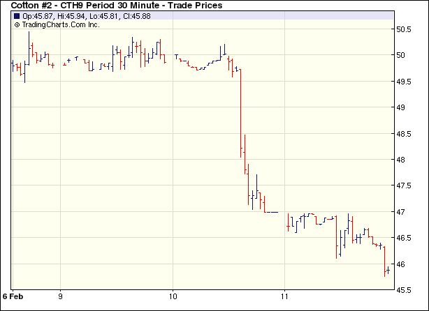 美國的失業(yè)情況正在惡化,居民消費(fèi)進(jìn)一步萎縮,對于經(jīng)濟(jì)層面的擔(dān)憂牽制整個商品市場的走勢。USDA(美國農(nóng)業(yè)部)的月報(bào)利空效應(yīng)尚未散去。11日紐約期棉市場繼續(xù)下跌,繼前一日跌停表現(xiàn)后,近期合約跌幅超過百點(diǎn),結(jié)算價45.83美分/磅;其持倉量繼續(xù)減少,多數(shù)轉(zhuǎn)至0905月合約。全球經(jīng)濟(jì)環(huán)境不濟(jì),美國新政府奮力救市,投資者對市場的信心暫未恢復(fù),當(dāng)日期棉市場從開盤即遭遇投機(jī)商多頭清算壓力,盤中更是受到外部谷物、原油期貨下跌連累,整日交易處于弱勢狀態(tài),3月合約跌破關(guān)鍵支撐點(diǎn),以近低點(diǎn)水平收盤。 紐約棉花期貨首期0903合約近三個交易日交易走勢 |