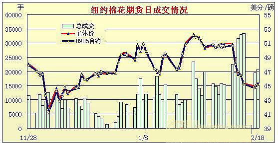 經(jīng)歷前五個交易日下跌后,18日紐約期棉市場以小幅上漲收盤,近期3月合約收于43.88美分/磅,漲35點,主力5月合約45.09美分/磅,漲41點。當(dāng)日市場開盤前四個小時一直處于弱勢下跌狀態(tài),外部市場持續(xù)下跌給予的壓力明顯。后拋開外部壓力,市場在技術(shù)買盤和空頭平倉支持下反彈走高,在前五個交易日累計約下跌600點后以小陽報收。 紐約棉花期貨主力0905合約近三個交易日交易走勢 |