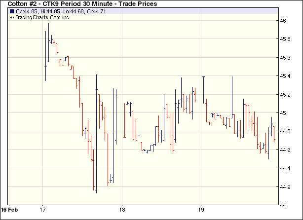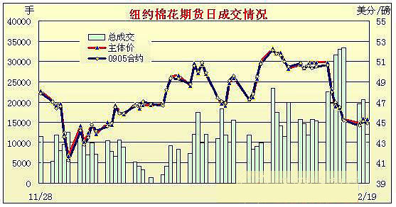 在美元下跌和原油期貨上漲的托舉下,紐約期棉市場高開高走。美國道瓊斯工業(yè)平均指數(shù)下跌給市場帶來壓力,19日紐約期棉小幅下跌,近期3月合約收于43.32美分/磅,跌47點,主力5月收于44.91美分/磅,跌19點,其它合約均下跌20余點。2月23日為3月合約第一個交割通知日,交易商清算該合約頭寸,因此其跌幅大于其它合約。 紐約棉花期貨主力0905合約近三個交易日交易走勢 |
