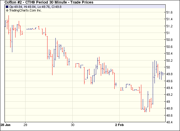 2月2日,受外部谷物市場下跌刺激,紐約期棉市場開盤遭遇到多頭拋盤壓力,低開低走,尾段出現(xiàn)逆轉(zhuǎn),最終以小幅收漲結(jié)束了四連陰的局面。當(dāng)日近期3月合約收于49.71美分/磅,漲30點;0805月合約收于50.80美分/磅,漲36點。3月合約最低下跌到48.69美分(-72點),跌破技術(shù)支持點48.89美分。但3月合約在49美分處得到明顯的支撐,有買盤低點拉升,市場最終先弱后強(qiáng),小幅收陽。 2月10日美國農(nóng)業(yè)部將發(fā)布供需預(yù)測月報,13美國國家棉花總會也將發(fā)布首份2009年美國棉花種植意向,交易上密切關(guān)注。另外,有分析師指出,如果春節(jié)過后中國外棉采購勢頭增強(qiáng),將對市場形成支持。 紐約棉花期貨首期0903合約近三個交易日交易走勢 |