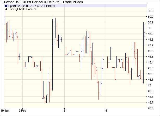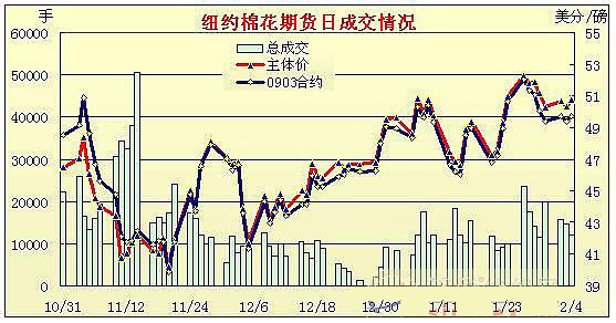 2月4日紐約期棉小幅收漲,近期3月合約收于49.67美分,漲29點,0905收于50.58 美分,漲26點。3月合約盤中最高點50.10美分,最低點49.02美分,即波動區(qū)間為108點。當(dāng)日市場開盤走低,但當(dāng)3月合約在靠近49美分時得到技術(shù)性買盤支持,反彈沖破50美分一線。后買盤跟進力量不足 ,市場小幅回落。當(dāng)外部谷物市場開盤后,大豆和玉米期貨走強,同時原油期貨走高,加上有空頭平倉支持,市場最終穩(wěn)定收漲。 紐約棉花期貨首期0903合約近三個交易日交易走勢 |