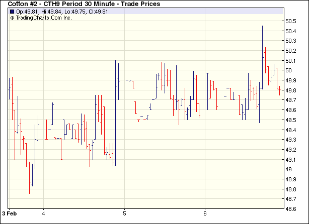 2月6日,紐約期棉市場小幅收陽,近期3月合約收盤價49.86美分/磅,漲15點;0905月合約收于50.43美分/磅,漲9點。市場成交相對活躍,近3萬手。當(dāng)日紐約期棉市場遭遇獲利回吐的壓力轉(zhuǎn)頭下跌。外部市場美國股市、大豆期貨、小麥和玉米期貨走強,以及美元走弱和投機買盤給期棉市場一定支持,下跌勢頭得到穩(wěn)定,最終小幅收陽。 紐約棉花期貨首期0903合約近三個交易日交易走勢 |