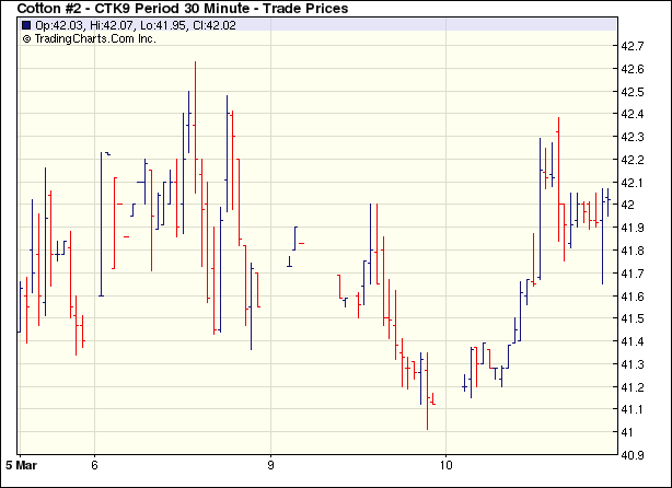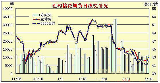 3月10日,美國花旗銀行預(yù)期盈利利好刺激美國股市暴漲,美元走弱,同時市場分析USDA將小幅調(diào)高美棉出口,刺激期棉大幅拉升,雖有回調(diào),但盤終各合約均漲60多點(diǎn)。當(dāng)日紐約期棉小幅高開,美元疲弱,谷物和能源市場上漲刺激期棉上沖,隨后美股開盤大漲,投機(jī)買盤不斷進(jìn)場,刺激期棉大幅上揚(yáng),雖然部分平倉盤獲利套現(xiàn),但主力5月合約依然攀升至日內(nèi)高位42.38美分(漲幅為123點(diǎn)),但隨后美元跌勢減弱、谷物漲勢縮窄,原油回落令期棉從高位回落,盤終5月合約漲62點(diǎn)收于41.80美分,其它合約也大多漲60多點(diǎn)。 紐約棉花期貨首期0905合約近三個交易日交易走勢 |
