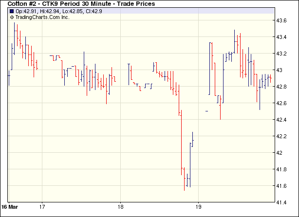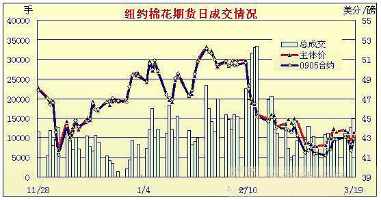 3月18日美元尾盤的暴跌和19日的延續(xù)大跌促成大宗商品的普漲,因此紐約期棉高開高走,保持強(qiáng)勢(shì),盤終各合約漲幅均超過(guò)110點(diǎn)。3月19日紐約期棉在外圍的普漲之下,5月合約開盤42.50美分(漲幅接近80點(diǎn)),并在投機(jī)買盤的推動(dòng)下繼續(xù)大幅上攻,盤中最高沖至43.48美分(漲幅為176點(diǎn)),但期棉基本面并無(wú)消息,另外公布的美棉出口周報(bào)也顯示美棉出口略現(xiàn)減速,期棉走勢(shì)高位壓力較大,由高位滑落,但盤終依然保持大漲,另外成交量有所放大。 紐約棉花期貨首期0905合約近三個(gè)交易日交易走勢(shì) |
